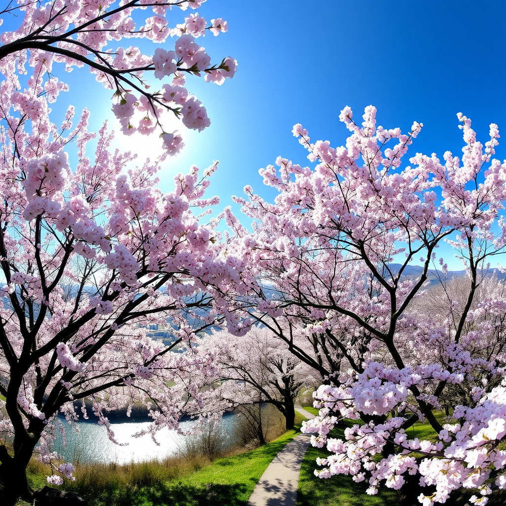 A breathtaking panorama of cherry blossoms in full bloom, their delicate pink and white petals forming a lush canopy under a clear, bright blue sky. Sunlight filters through the branches, casting dappled light on a tranquil pond below. Gentle breezes carry the soft scent of blossoms, creating a serene and enchanting atmosphere. A narrow winding path meanders through the grove, inviting quiet contemplation amidst the natural beauty. In the distance, rolling hills provide a stunning backdrop, completing this idyllic springtime scene.