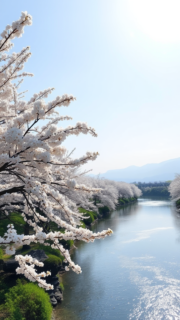 A breathtaking panorama of cherry blossoms in full bloom under a serene, cloudless sky, with gentle sunlight filtering through, casting delicate shadows on a tranquil river below, its waters shimmering like liquid silver, surrounded by lush greenery and distant majestic mountains.