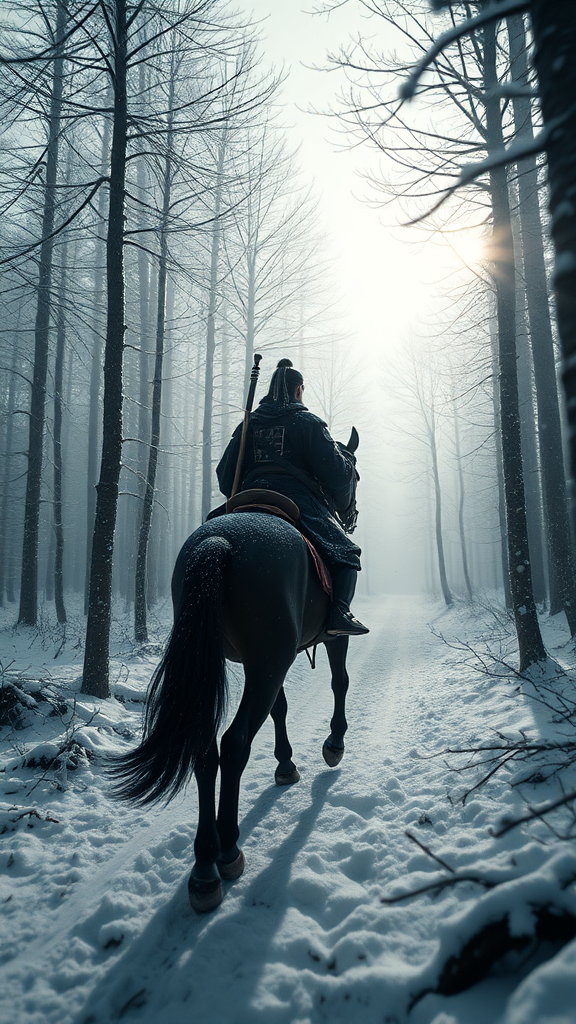 A breathtaking panoramic scene unfolds, inspired by Japanese ink art in striking black and white. In the heart of a snowy forest, a samurai elegantly rides a horse, captured with dreamy cinematic lighting. Utilizing the power of Unreal Engine 5 and expert color grading, this editorial masterpiece mimics the authenticity of a professional photography shoot. Shot on a 70mm lens with meticulous depth of field and tilt blur, every element—from the moody halfrear and backlight to the natural incandescent glow—combines to create a stunning visual narrative. The soft volumetric lighting highlights the snow's shimmering texture with accent lighting, enabling global illumination techniques such as screen space and ray-traced reflections. A subtle red rim light adds a cool 45% color grading contrast, amplified by optics scattering and shadow play. The hyper-detailed and dynamic composition, inspired by the styles of Artgerm and Alex Ross, integrates various CGI and VFX techniques. This includes advanced shaders, post-processing, cel shading, and tone mapping, resulting in a hyper-realistic, super detailed image. The global illumination, ray tracing ambient occlusion, and anti-aliasing technologies further refine this epic samurai scene, presenting a perfect blend of SFX sophistication and artistic elegance.