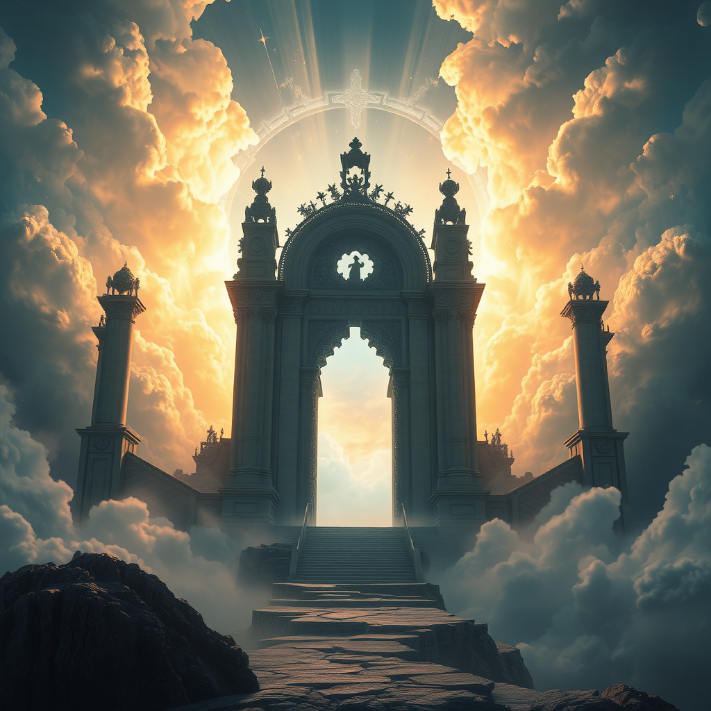 A breathtaking panoramic view of the gates to heaven, rendered in full detail and 8k resolution, captures the essence of Ivan Aivazovsky, Peter Mohrbacher, and Greg Rutkowski's styles. The scene is suffused with an ethereal, atmospheric glow, accentuated by volumetric light effects and broad illumination, reminiscent of a masterful oil painting. This fantasy art piece, with elements of sci-fi, invokes a sense of realism and is designed to be a premium print. Utilizing the power of Unreal Engine, the gates are portrayed with grandiosity, set against a celestial backdrop, inviting reverence and awe, as heavenly clouds swirl gently around.
