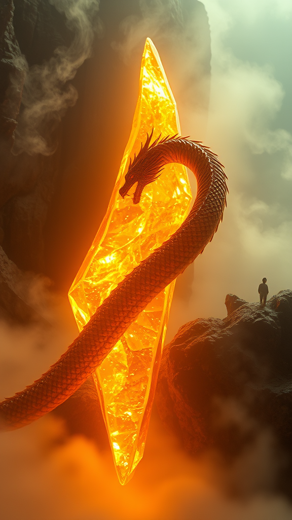 A breathtaking photograph of a spiraling dragon emerging gracefully from a gleaming amber shard, enveloped in a mystical luminescence. The cinematic mist swirls around, while the scene is captured with astounding detail and clarity, radiating an internal light that feels otherworldly. Set in a majestic and awe-inspiring environment, the image exudes a sense of enchantment and grandeur, with a finesse that suggests it's a standout in any prestigious photography contest, rendered impeccably as if crafted by the Unreal 5 engine.