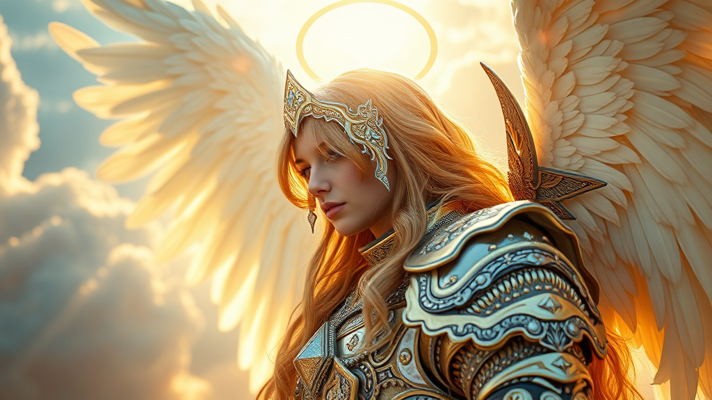 A breathtaking photograph of an angel adorned in intricate gold and silver crystal armor. The celestial backdrop of heaven sets the scene, with a radiant halo casting a gentle glow around the angel's head. Golden locks cascade down, complementing the ethereal presence of large, white feathered wings. Captured in a dynamic pose, this visual masterpiece features precise linework and vibrant colors, drawing inspiration from artists like Carne Griffiths, Conrad Roset, and Anna Dittmann. The scene unfolds in cinematic detail, embodying the stunning beauty of the golden hour without any flaws or distractions.