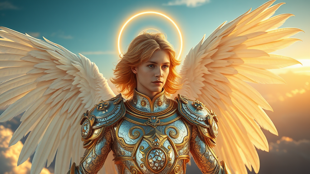 A breathtaking photograph of an angel adorned in shimmering crystal armor of gold and silver, set against the ethereal backdrop of heaven. A radiant halo glows around its head, illuminating golden hair and majestic white feathered wings. The scene is centered and highlights intricate, highly detailed visuals, capturing the angel's dynamic pose with vibrant, cinematic precision. The style echoes the works of Carne Griffiths, Conrad Roset, and Anna Dittmann, ensuring exquisite beauty and meticulous linework. Presented in 8k quality during a golden hour, the image is free from imperfections and distractions, maintaining flawless anatomy and composition.