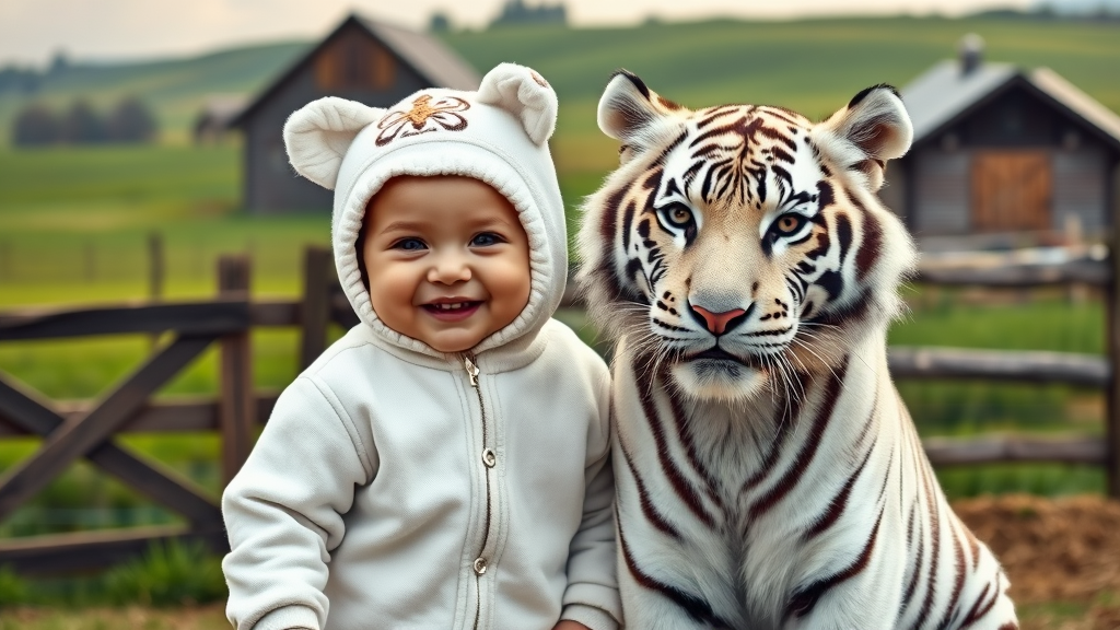 A breathtaking, photorealistic image of a baby and a young white tiger posed side by side, both looking directly into the camera. The baby flashes a joyful smile, dressed in an adorable, snug white outfit adorned with tiger stripes mirroring the exquisite fur pattern of the white tiger. The outfit features a charming hat complete with little tiger ears. Both the baby and the tiger appear to be of similar size, enhancing their unique bond. They are set against a picturesque farm backdrop, complete with a rustic barn, wooden fence, and vibrant green fields stretching into the distance. Textures and details are captured with remarkable clarity, from the softness of the baby's outfit to the intricacy of the tiger's fur and the subtle richness of the farm setting. A soft morning light bathes the scene, adding a warm, golden glow to their peaceful surroundings.