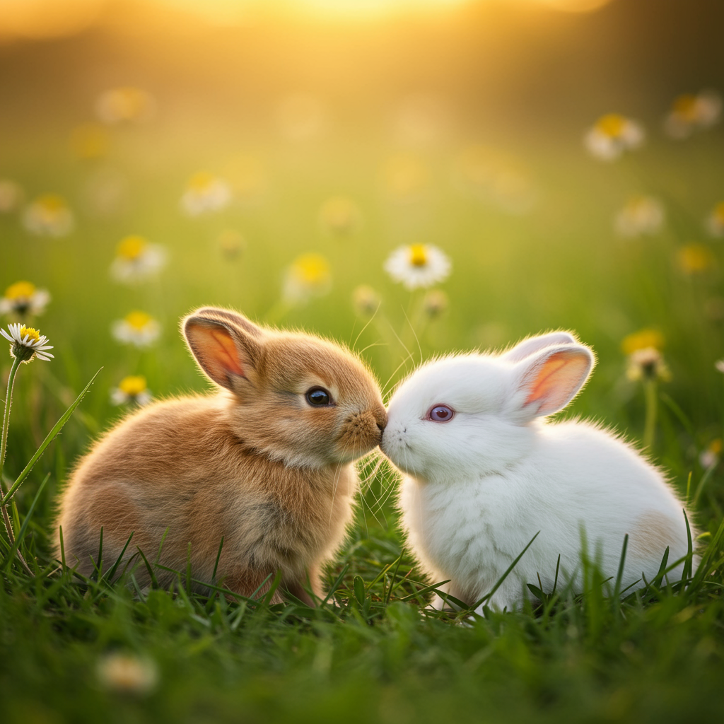 A breathtaking photorealistic scene with cinematic lighting showcasing two baby rabbits gently nuzzling each other, one with a soft, light brown fur and the other pristine white, amidst a lush meadow bathed in the warm glow of golden hour, their delicate whiskers and tiny ears highlighted by the sun's rays, with a backdrop of softly swaying wildflowers adding a touch of enchanting serenity.