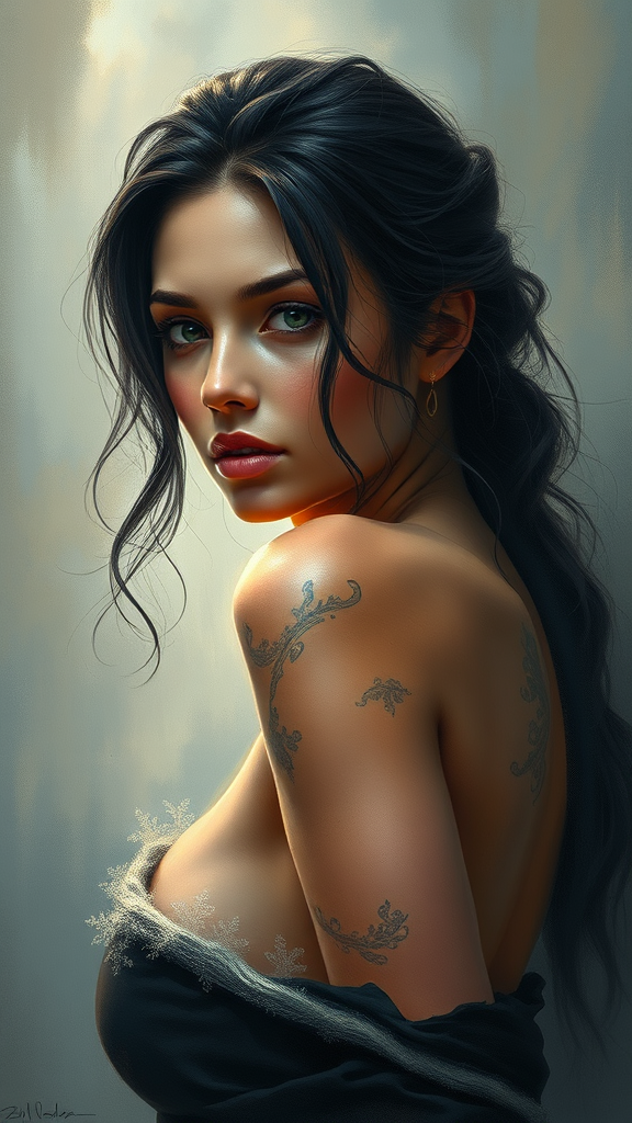 A breathtaking piece capturing Megan Fox in a full-body portrait as a stunning artwork, reminiscent of a professional, majestic oil painting by Ed Blinkey, Atey Ghailan, and Studio Ghibli. Influenced by the intricate details and sharp focus of Jeremy Mann and Greg Manchess, combined with Antonio Moro's dramatic flair, this photorealistic painting exudes an ethereal charm, trending on ArtStation and CGSociety. The portrayal, inspired by Midjourney and Greg Rutkowski, introduces a hint of fantasy with delicate brushwork, creating a masterpiece that bridges reality and imagination, enveloped in an aura of timeless beauty.