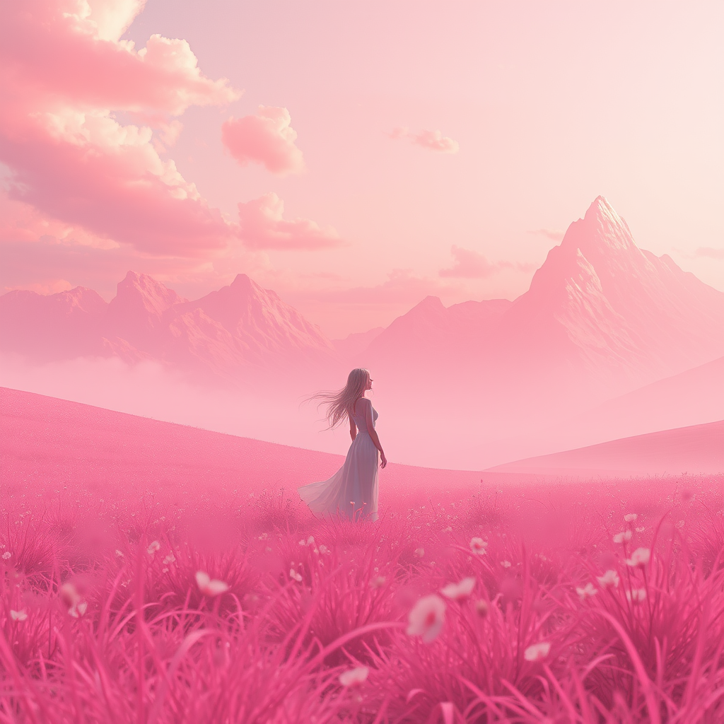 A breathtaking pink landscape bathed in perfect gradients of pink shading and atmospheric lighting, reminiscent of the works of Makoto Shinkai, Stanley Artgerm Lau, WLOP, and Ross Draws. The scene showcases a serene environment where everything from the sky to the ground is enveloped in a harmonious pink hue. Soft pink clouds drift across the sky, casting gentle shadows over a tranquil pink meadow dotted with delicate flowers swaying in the breeze. In the background, majestic pink-hued mountains rise, their peaks kissed by the soft glow of a setting sun. A lone figure, gracefully poised, stands amidst this wonderland, their form captured in delicate detail, with flowing hair and attire that blend seamlessly into the pink ambiance. The entire scene is imbued with a dreamy, ethereal quality, inviting viewers to lose themselves in its calm and serene beauty.