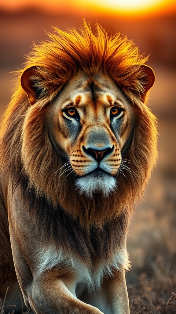 A breathtaking portrait captures a majestic male lion basking in the golden glow of the African savannah at twilight. This commanding predator embodies strength and dominance, with intense amber eyes gazing confidently into the distance. His noble mane, with rich tawny shades, catches the light, creating a glorious halo around his head. The lion’s muscular physique is brimming with energy, his sleek fur shimmering in the warm, radiant light of the setting sun. Using a Canon EOS-1D X Mark II DSLR camera paired with a 300mm f/2. 8L IS II USM lens, this image beautifully captures every intricate detail of the lion's majestic features at a resolution of 20. 2 megapixels and an ISO sensitivity of 800. The camera was set to aperture priority mode with an aperture of f/2. 8, yielding a shallow depth of field and an exquisite bokeh effect in the background. A shutter speed of 1/1000 sec was chosen to freeze the lion's movement in perfect clarity. A circular polarizing filter was employed to cut glare and intensify the vivid colors of the sky and grasses for added depth and dimension. The lion’s penetrating gaze and the striking lighting craft a powerful atmosphere of presence and allure, resulting in a masterful statement piece. Post-processing in Adobe Lightroom and Photoshop involved meticulous color grading and contrast adjustments to amplify the lion's natural allure, creating a hyper-realistic, super-resolution image that is both stunning and awe-inspiring. The remarkable result is an image of unparalleled beauty and timelessness, epitomizing the essence of the African savannah and its most iconic predator, hyper-realistic, Super-Resolution, UHD, DTM, HDR, 8K --ar 3:2 --q 2 text, logo.