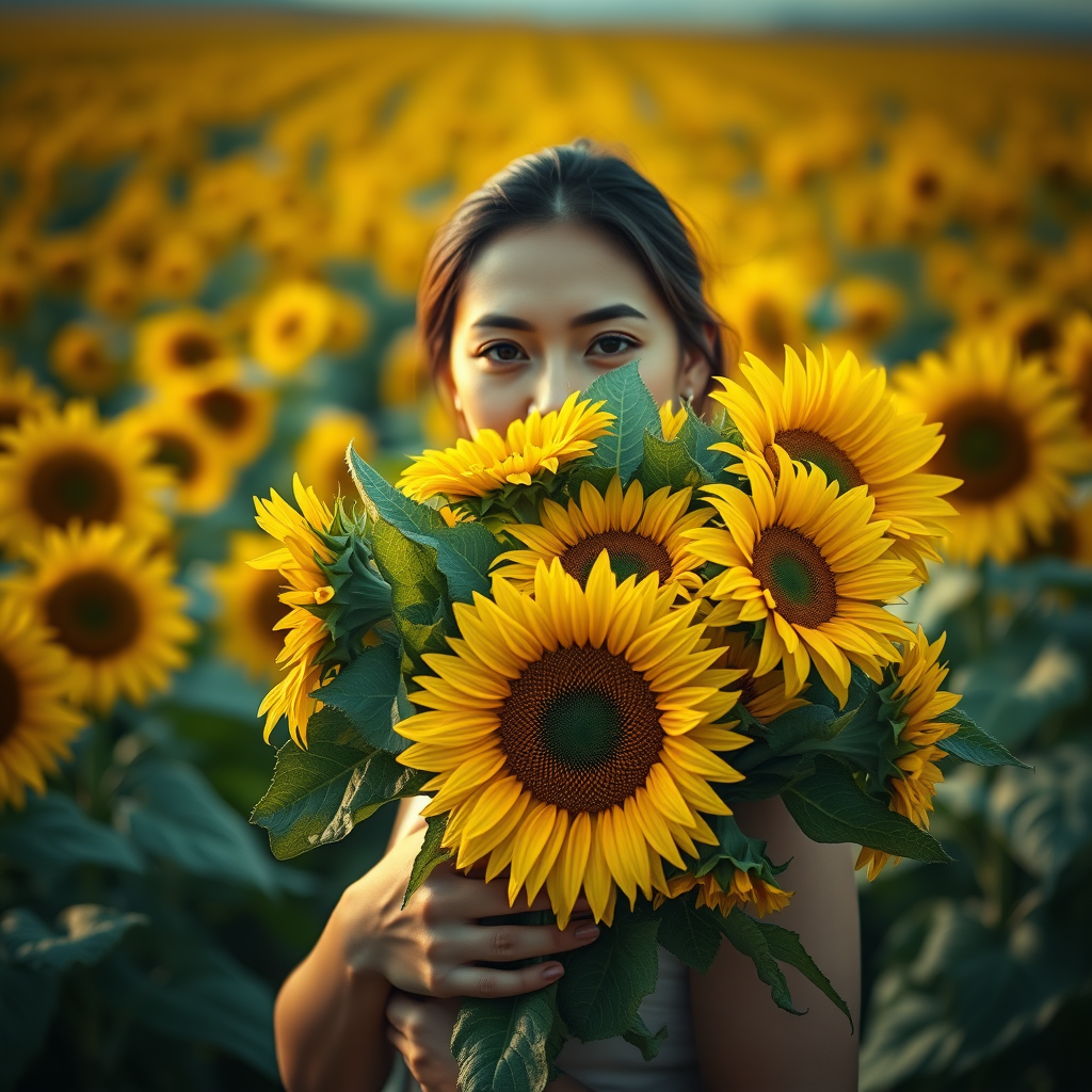 A breathtaking portrait captures a woman holding a vibrant bouquet of sunflowers, their rich yellows and deep greens in striking contrast against her serene expression. The scene's depth of field is intentionally shallow, gently blurring an endless field of towering sunflowers stretching into the horizon behind her. Each petal and leaf is rendered with hyper-realistic precision, enhanced by cinematic lighting that casts a warm, golden hue over the entire composition, creating an atmosphere of tranquility and natural grandeur. The image is a stunning 8K masterpiece, exuding a sense of connection with the beauty of nature, subtly different yet resonant with the initial concept.