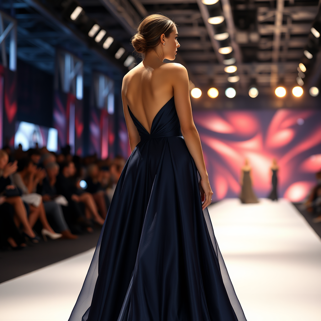 A breathtaking portrait of a beautiful female model gracefully poised at the end of a runway, with the bustling fashion show creating a dynamic backdrop. She wears a magnificent and sophisticated full-length gown, captured in sharp focus with exquisite detail. The scene is bathed in cinematic lighting, emphasizing the elegance and splendor of the moment, rendered in 4k UHD resolution for a truly immersive experience.