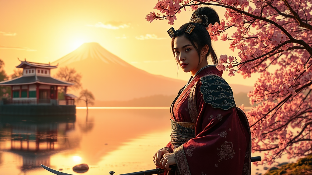 A breathtaking portrait of a female samurai poised gracefully by a serene lake surrounded by blooming cherry trees, with the majestic silhouette of Mount Fuji in the background. It's a vibrant spring sunset, casting a warm, golden glow over the scene. The samurai's attire is intricately detailed, adorned with delicate patterns that capture the eye. Her expression radiates strength and serenity, encapsulating a story of honor and grace. The digital artwork displays vibrant colors and cinematic depth, accentuated by volumetric lighting that adds a dreamlike quality to the atmosphere. Inspired by the style of Anna Dittmann, this masterpiece stands as a testament to exquisite artistry, complete with a subtle artist signature and copyright watermark, created with precision and passion.