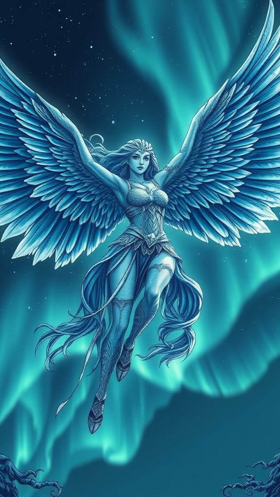 A breathtaking portrait of a female valkyrie gracefully descending with the aurora borealis as a vibrant backdrop, showcasing intricate and highly detailed line art that captures her stunning beauty. The scene embodies a comprehensive cinematic quality reminiscent of Bastien Lecouffe-Deharme, enveloped in a volumetric atmosphere at midnight. The portrayal highlights flawless anatomy, with precise renderings of her majestic wings and ethereal armor. The majestic aurora illuminates the scene, enhancing the valkyrie's divine presence against a seamless low-resolution background free from any distortions or unwanted artifacts. This artistic vision emphasizes elegance and marvel without any unsightly elements.