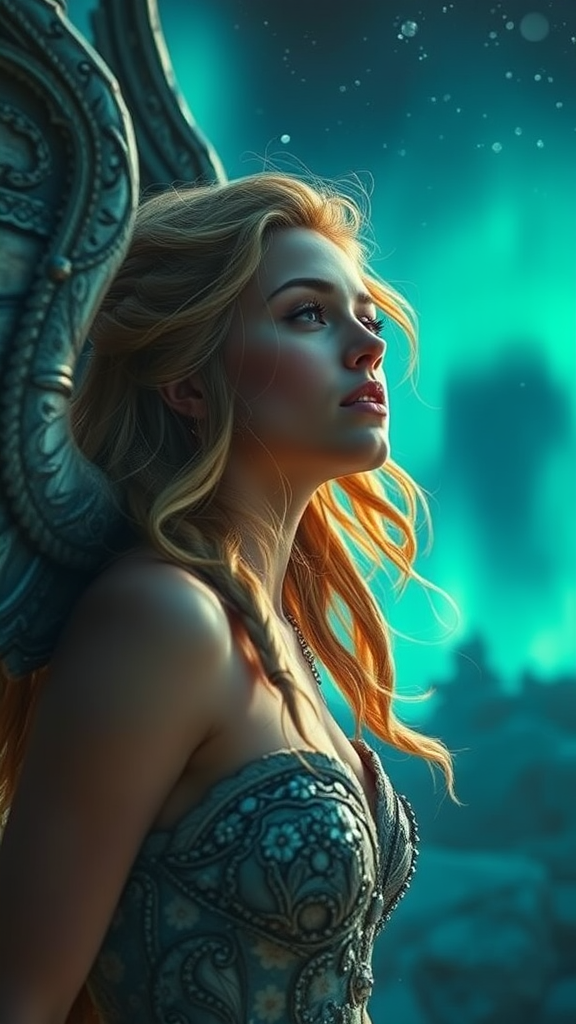 A breathtaking portrait of a female valkyrie gracefully descending with the aurora borealis illuminating the sky behind her. She exudes intricate beauty, and the meticulous attention to detail renders her captivatingly vibrant. The composition captures a cinematic atmosphere, inspired by the artistry of Bastien Lecouffe-Deharme, with a subtle volumetric ambiance amidst the midnight hues. Despite the majestic portrayal, there are imperfections reminiscent of an abstract, low-resolution rendering—imbued with jpeg artifacts and errant strokes. Features may seem disjointed or misplaced, hinting at missing or extra digits, and limbs slightly out of proportion. This artistic interpretation retains its ethereal charm while subtly embracing the enigmatic allure of surreal flaws and dreamlike distortions without explicit identifiers such as text, watermarks, or signatures.