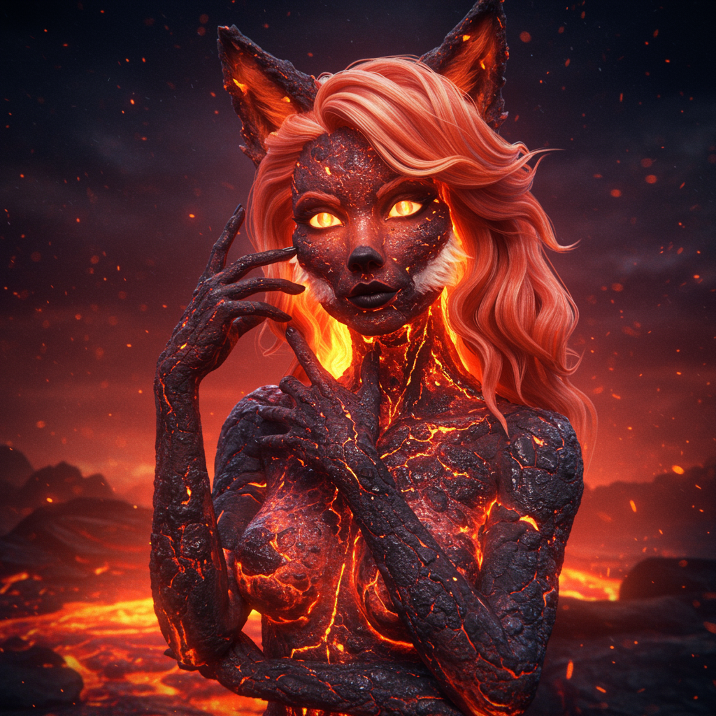 A breathtaking portrait of a fox lady composed of molten magma and glowing lava, embodying ethereal beauty and charm. Inspired by Charlie Bowater, this masterpiece features a sharp focus on her exquisite face and delicate hands. Set within a volumetric atmosphere, the artwork boasts vibrant and intricate details, showcasing precise line art and cinematic depth. The high-resolution digital art captures her in a dynamic pose, highlighting her refined anatomy and flawless form. Impeccably detailed with stunning colors and textures, this award-winning piece trends on ArtStation, offering an unparalleled viewing experience in 4K UHD.