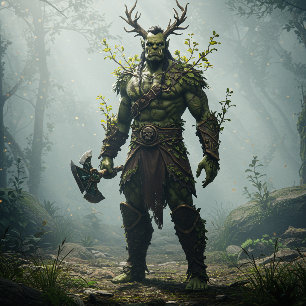 A breathtaking portrait of a hyper-realistic male orc druid, bathed in dramatic, ethereal light that pierces through a soft, mystical fog, showcasing intricate details in 4K resolution. The scene is rendered with the stunning realism of Unreal Engine 5, evoking the artistic style of John William Turner. The orc druid stands in full view, clad in natural attire adorned with vines and leaves, his skin textured with a lifelike, rugged complexion. His eyes gleam with wisdom, reflecting a deep connection with nature, while his environment, a lush, enchanted forest, breathes with the subtle movements of ancient magic.