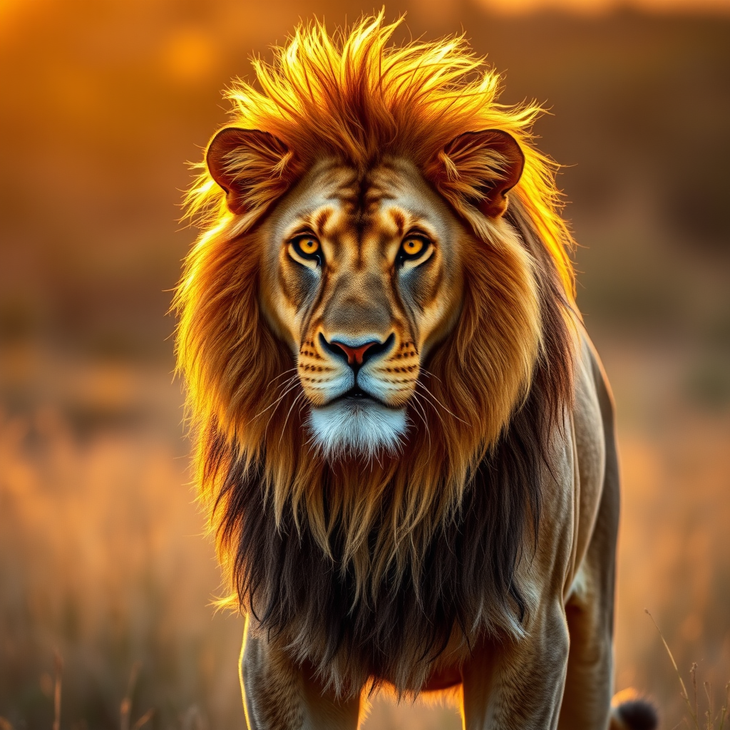 A breathtaking portrait of a majestic male lion standing proudly in the luminous glow of the African savannah. This magnificent predator radiates power and authority, his intense yellow eyes fixed boldly on the horizon. His stately mane frames his face, its golden tones illuminated, creating a halo-like aura around his head. The lion's muscled physique is charged with vitality, and his sleek fur shimmers in the warm light of the setting sun. Capturing this extraordinary creature in full grandeur, the scene was shot with a Canon EOS-1D X Mark II DSLR camera using a 300mm f/2.8L IS II USM lens. The 20.2-megapixel resolution and ISO sensitivity of 800 ensured every exquisite detail of the lion’s features was preserved. With the camera set to aperture priority mode at f/2.8, the shallow depth of field rendered a stunning bokeh effect in the background. To capture the lion’s dynamic posture, a shutter speed of 1/1000 sec was employed. A circular polarizing filter was used to minimize glare and enrich the colors of the sky and foliage, adding depth to the image. The lion's penetrating eyes and dramatic lighting conjure an aura of presence and intensity, elevating the image to a striking statement piece. Post-processed in Adobe Lightroom and Photoshop, the image underwent meticulous color grading and contrast refinement to heighten the lion's inherent grace, resulting in a hyper-realistic, super-resolution masterpiece that evokes the timeless allure of the African wilderness and its commanding predator, hyper-realistic, Super-Resolution, UHD, DTM, HDR, 8K, aspect ratio 3:2, high quality, without text or logo.