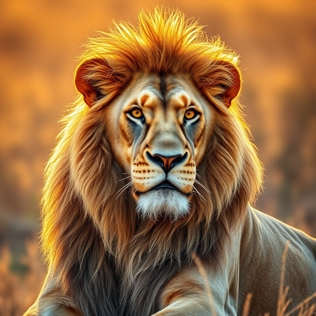 A breathtaking portrait of a noble male lion basking in the golden glow of the African savannah. This majestic predator radiates strength and dominance, his piercing yellow eyes gazing intently into the distance with fearless resolve. His magnificent mane, with its rich tawny shades, catches the sun's rays, forming a stunning halo effect around his formidable face. The lion's powerful physique is primed with energy, and his sleek coat shimmers in the warm, radiant light of the setting sun. Captured with a Canon EOS-1D X Mark II DSLR and a 300mm f/2.8L IS II USM lens, the image boasts a resolution of 20.2 megapixels and ISO 800, ensuring every detail of the lion's noble features is rendered with clarity. Utilizing aperture priority mode at f/2.8 created a captivating shallow depth of field and a remarkable bokeh background. A shutter speed of 1/1000 sec was employed to encapsulate the lion's dynamic presence. Employing a circular polarizing filter, the glare was minimized, enhancing the vibrant hues of the sky and savannah grasses. The lion's vigilant expression, combined with the dramatic lighting, delivers a profound sense of presence, making this image an extraordinary masterpiece. Post-processing in Adobe Lightroom and Photoshop involved meticulous color enhancements and contrast adjustments to accentuate the lion's innate beauty, crafting an image that is hyper-realistic, striking, and awe-inspiring. The resulting portrait is a timeless capture that epitomizes the essence of the African wilderness and its most formidable predator, with super-resolution, UHD quality, DTM, HDR, 8K resolution, and a stunning 3:2 aspect ratio.