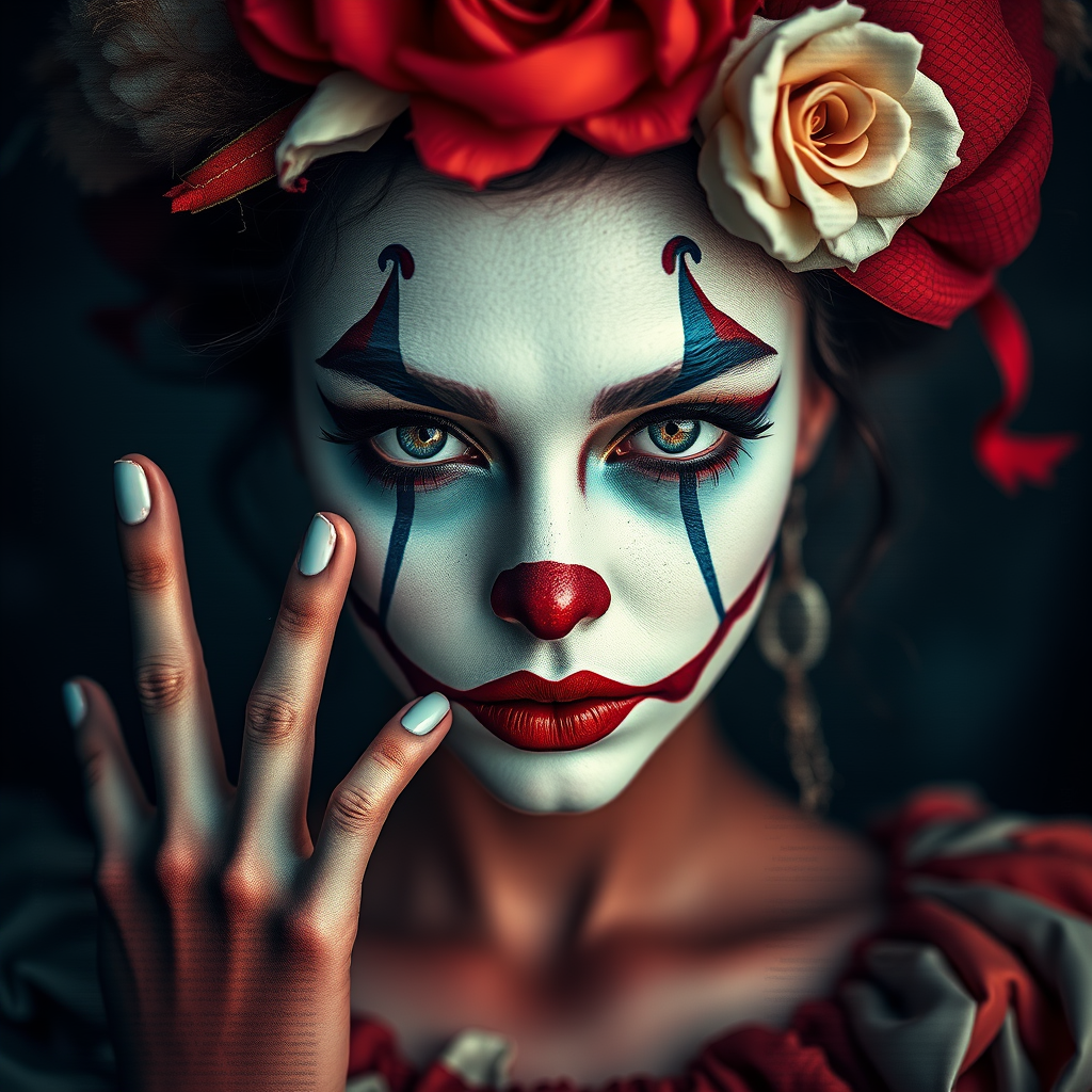 A breathtaking portrait of a woman adorned with mesmerizing clown makeup, centered and showcasing intricate details. Her beauty is captivating, with precise lineart and a vibrant palette. The scene captures a comprehensive cinematic atmosphere, featuring a dynamic pose and top-tier quality, reminiscent of Stefan Gesell's style. Despite any lowres or textural imperfections, the visual remains stunning. The character embodies artistic challenges like missing fingers or extra digits, with an interplay of cropped elements, jpeg artifacts, and other distortions. There's an artistic exploration of anatomy with unexpected features like extra limbs, yet the focus remains on her enigmatic expression. Blurring and fuzziness add to the mystery, with occasional misshaped forms creating a collage of surreal beauty. Overlays of text and possible watermarks hint at an underlying artistic narrative, invoking a sense of intrigue and wonder.