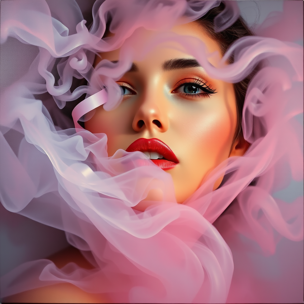 A breathtaking portrait of a woman enveloped in a swirling cloud of smoke, infused with highlights of soft pink and pastel hues. Her make-up is subtly pink, enhancing her sultry and seductive gaze. The scene is misty, evoking a sense of mystery and allure. The painting exudes hyper-realism, capturing every delicate detail in an oil painting style, showcasing aesthetic modern art with an artistic flair.