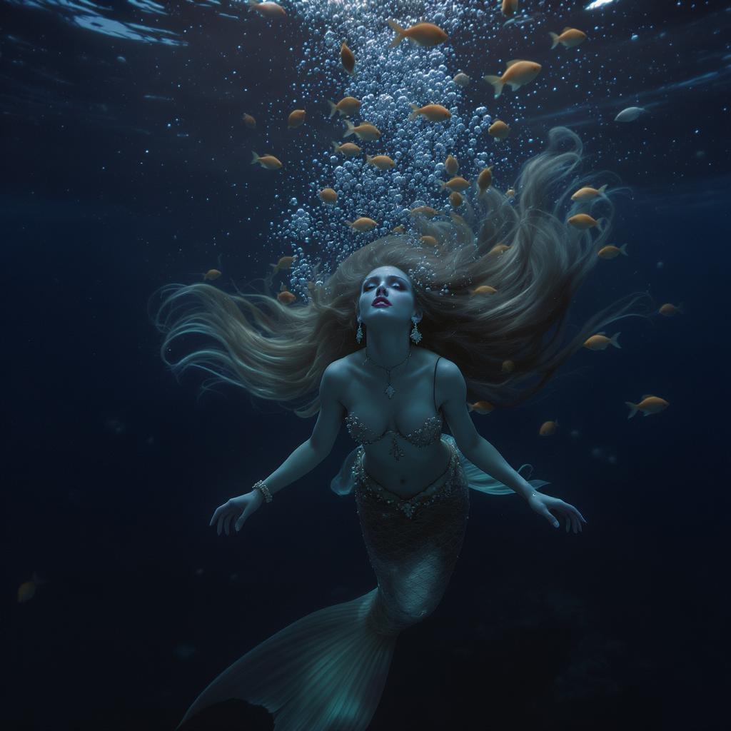 A breathtaking portrait of an ethereal mermaid with flowing, luxurious long hair that ripples through the water like silk. Swirling around her are countless delicate goldfish, their scales glinting softly amid the shadows of the ocean depths. Enveloped by the vibrant tapestry of marine life, she floats gracefully, her serene expression glowing amidst the subdued underwater twilight. The light filters down faintly, casting a gentle spotlight that highlights the intricate details of her ornate jewelry and shimmering tail. Rendered in a cinematic 35mm quality with an F/2.8 aperture, the scene captures every exquisite detail in 4k resolution, enhanced by a subtle vignette and masterful cinematic lighting, creating an atmosphere of elegance and mystery.