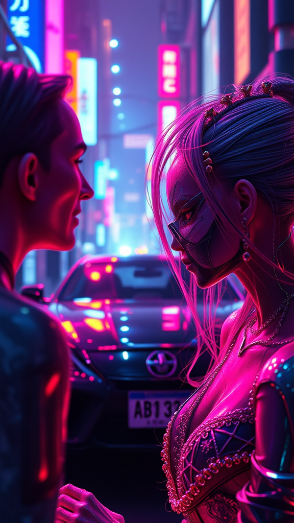 A breathtaking portrait of cyberpunk art displaying an ultra-realistic 8k resolution, featuring magnificent lens flare and a vibrant atmosphere. The scene is glowing with intricate and detailed colors, enhanced by cinematic lighting reminiscent of works trending on artstation. With a 4k hyperrealistic focus on extreme details, this masterpiece uses Unreal Engine 5 and showcases stunning lumen reflections. It creates a photography-like environment with a hyperrealistic car amidst a CGI and 3D atmosphere. Doll-like figures appear within the scene, rendered with Octane to achieve an exquisite finish. Flaws become artistic motifs with intentionally disfigured anatomy, adding a surreal touch with elements like extra arms and fingers, creating an abstract narrative. The piece embraces its imperfections, utilizing tiling and mutated forms to evoke an otherworldly sensation, seamlessly blending beauty and distortion into a singular, immersive experience.