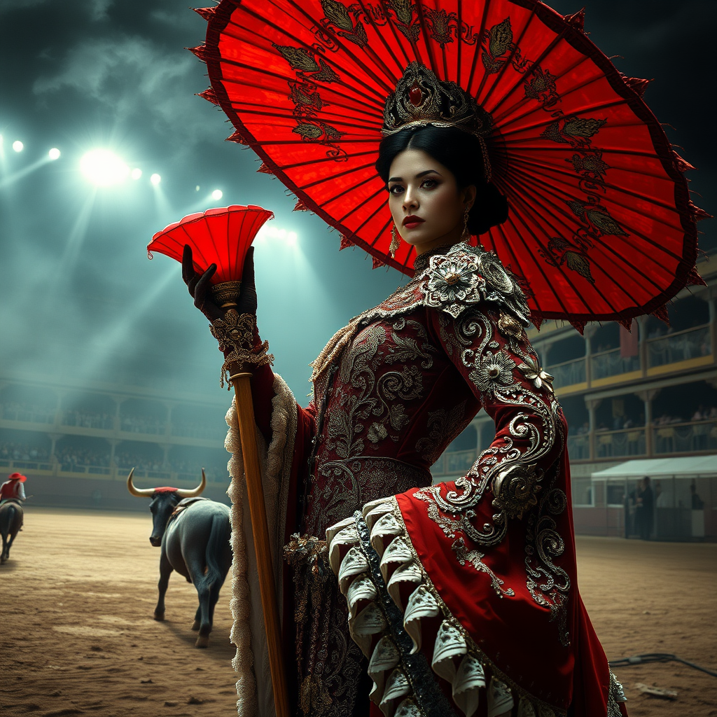A breathtaking portrayal of a magnificent female matador, gripping a vivid scarlet muleta, amidst a surreal and distorted bullfighting arena; she dons an exquisitely detailed and elaborate ensemble, embodying opulence and luxury. The scene is atmospheric and haunting, reminiscent of a matte painting, with cinematic and volumetric lighting casting dramatic shadows. Drawing inspiration from the artistry of Paul Bonner, Frank Frazetta, Brian Froud, and Ross Tran, the visual is a fusion of hypermaximalist style with ornate and intricate embellishments, creating a compelling and enigmatic ambiance.