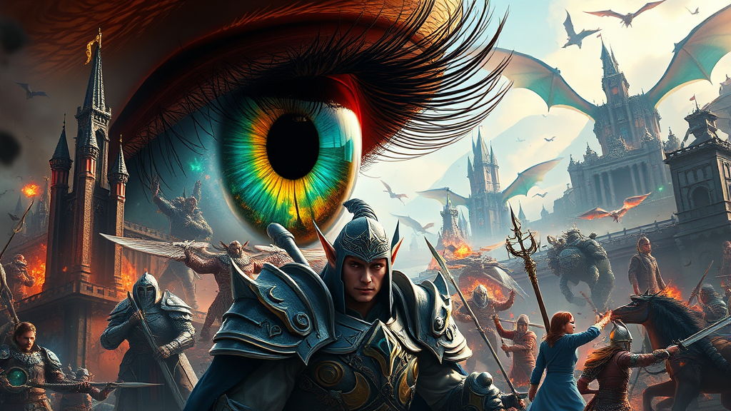A breathtaking poster-style photograph inspired by the Warcraft universe, showcasing unparalleled photographic realism and cutting-edge 3D artistry. Central to the scene is a hyper-realistic portrait of the main hero, an elf, in exquisitely detailed armor, standing amidst a chaotic battlefield alive with mythical creatures and dynamic magic. The scene is viewed through the elf's eye, capturing the grandeur of colossal castles reflected in their gaze, alongside soaring dragons, and fierce warriors locked in combat. The eye reflects flickers of enchantment, with vivid colors illuminating the chaos and valor of the confrontation, untouched by time yet brimming with an ever-present sense of legendary adventure.