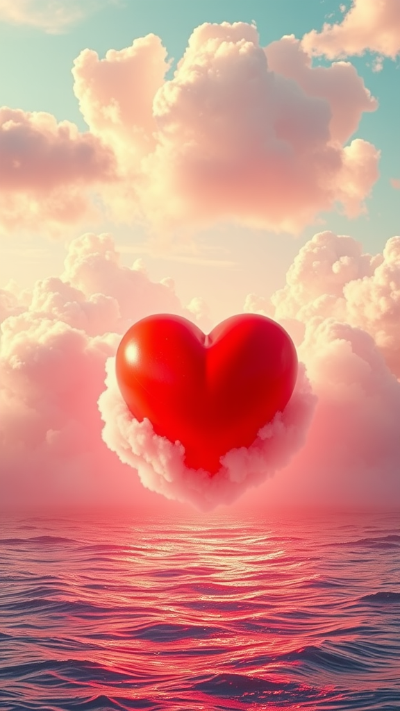 A breathtaking red heart nestled within billowing clouds over a shimmering water surface, rendered in a ZBrush-inspired style with hues of light pink and sky-blue, evoking awe with its stunning beauty and hyperbolic expression. Conjuring the intensity of NYC explosion coverage and the vivid realism of Unreal Engine 5, reminiscent of a Robert Bissell masterpiece, capturing the viewer in a mesmerizing dance of colors and emotions.