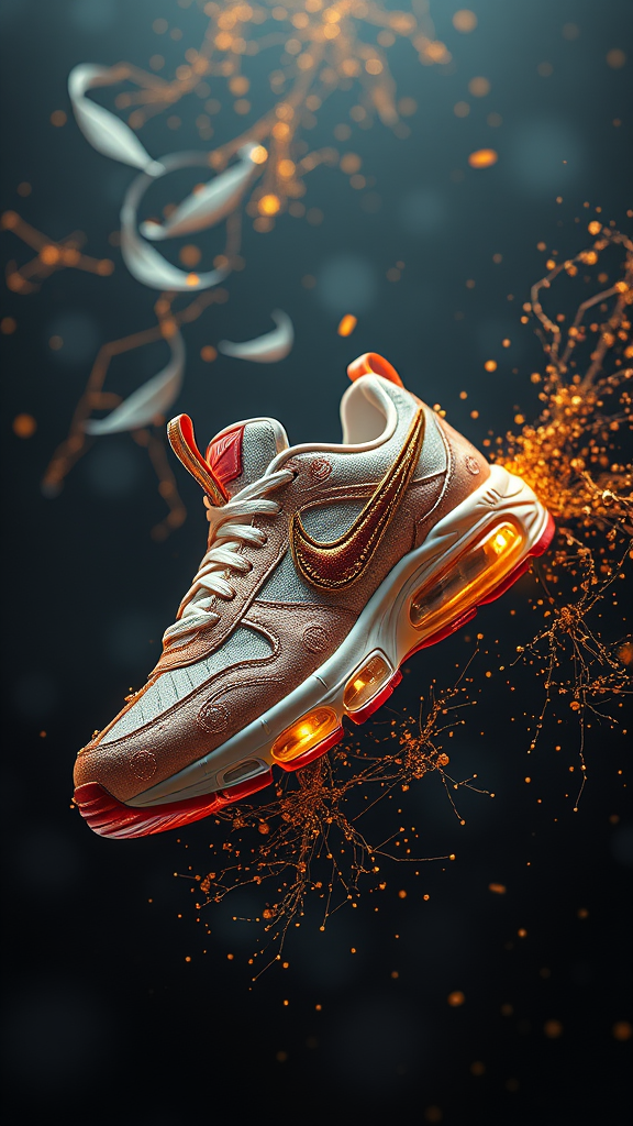 A breathtaking reinterpretation of a Nike sneaker, blending elements of a luxurious and cinematic advertisement. The design boasts intricate and hypermaximalist details, crafted with ornate precision. Drawing inspiration from the artistic styles of James Jean, Brian Froud, and Ross Tran, the sneaker emerges as a masterpiece in motion. The image exudes a sense of opulence and high fashion, merging the realms of digital art with the tangible world of cutting-edge footwear.