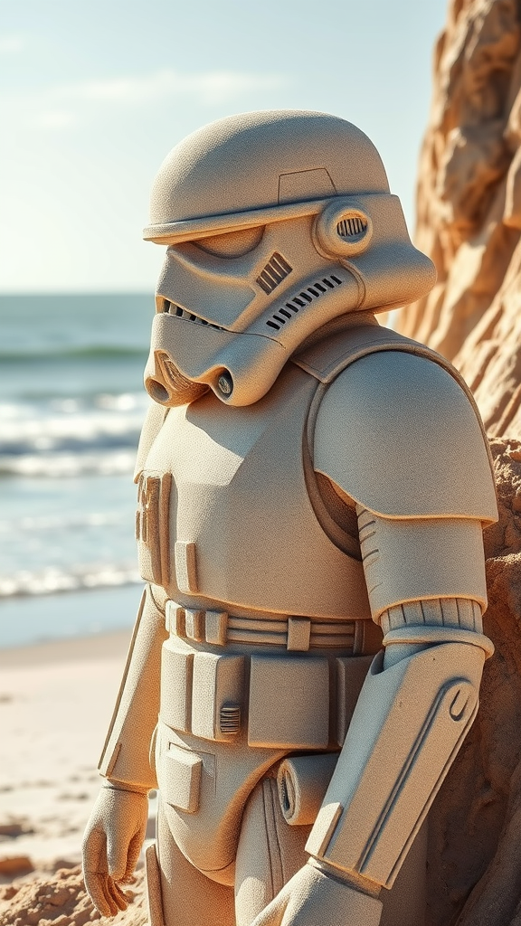 A breathtaking sand sculpture of a stormtrooper stands majestically on the sunlit beach, showcasing extraordinary craftsmanship and intricate detailing that captures the essence of the iconic figure. Delicate grains of sand are expertly shaped into the distinctive armor, with a lifelike helmet and meticulously carved features that draw admiration from all who pass by. The stunning design glistens under the gentle waves of the ocean, creating a striking contrast between the soft natural landscape and the formidable likeness of the stormtrooper, inviting beachgoers into a realm where creativity meets cinematic fantasy.