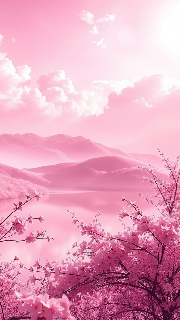 A breathtaking scene awash in shades of pink, featuring an ethereal landscape where every element seamlessly blends into the pink atmosphere. The light cascades gently, creating a dreamlike ambiance reminiscent of the styles of Makoto Shinkai, Stanley Artgerm Lau, WLOP, and Ross Draws. In the foreground, delicate cherry blossoms flutter gracefully, while a serene lake reflects the myriad hues of pink in the sky. Soft pink clouds drift lazily above, casting gentle shadows over rolling pink hills. The scene is a harmonious blend of nature and fantasy, with subtle creative modifications that add depth to this pink wonderland.