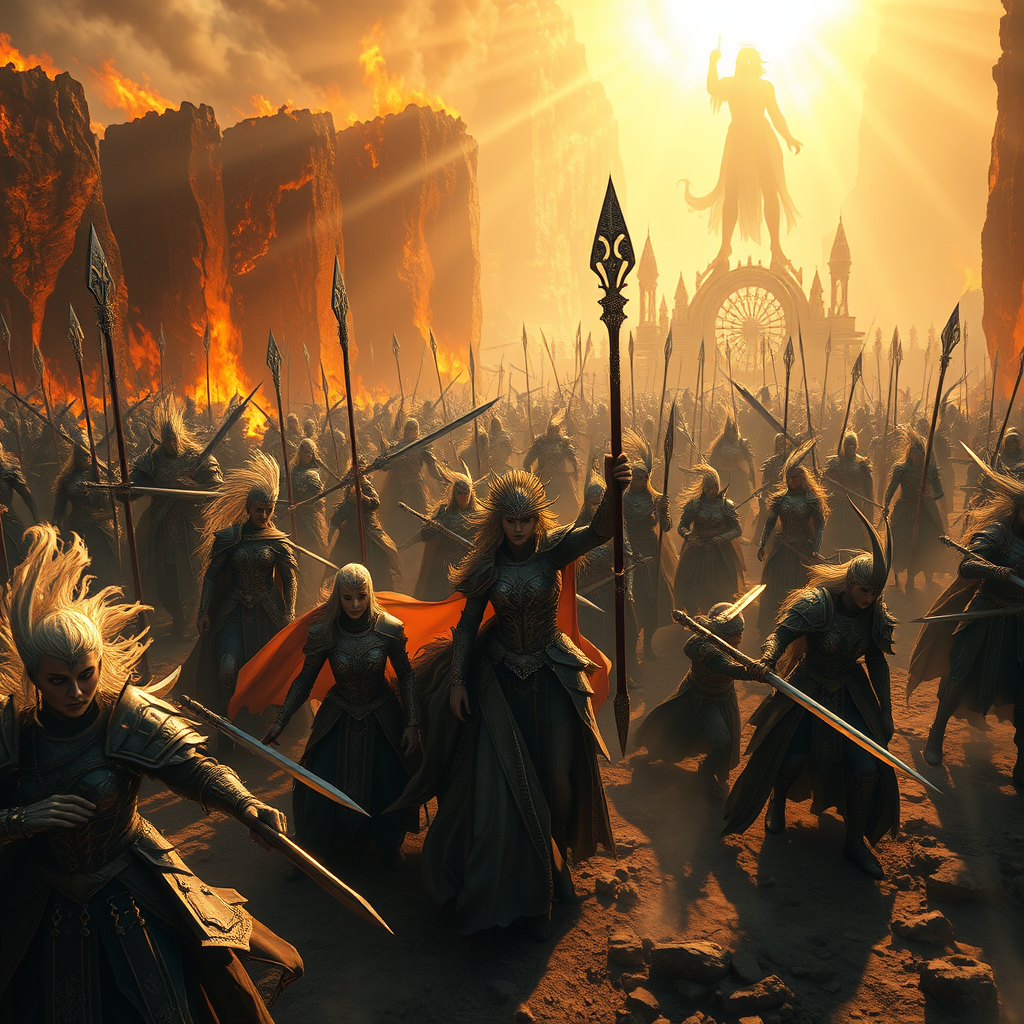 A breathtaking scene capturing a massive-scale battle where warrior women and elegant elven figures are locked in a grand conflict. The atmosphere exudes beauty and power, with a fierce goddess leading the charge. Their armor and weapons are intricately crafted, showcasing formidable artistry, set against a forgotten battlefield shrouded in mystery. Towering walls of fire form the backdrop, casting an imposing presence. The composition is an epic wide shot, with an aerial perspective enhancing the scope of the dark fantasy unfolding below. Rays of sunlight pierce through the swirling smoke, creating dynamic crepuscular rays that illuminate the scene with a photorealistic quality. The depth of focus is striking, offering a hyper-realistic portrayal of this complicated and maximalist visual narrative in the style of Dragon Age.