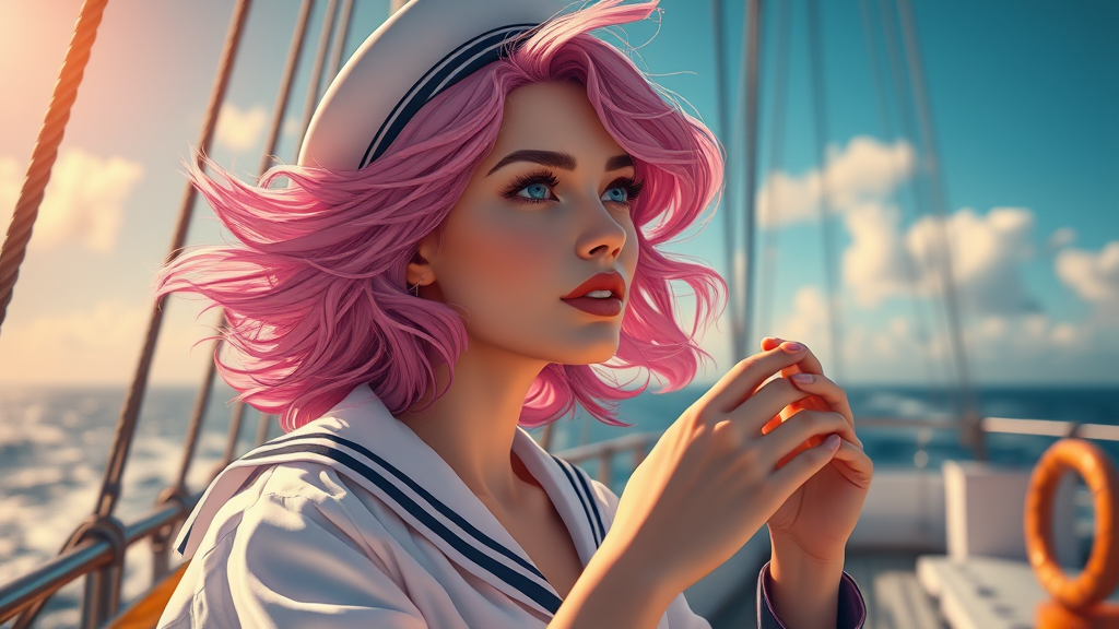 A breathtaking scene depicting a female sailor with medium wavy pink hair aboard a ship, savoring the refreshing sea breeze. The sunlight casts a warm glow, highlighting her beautifully sculpted face and delicate hands. The setting is captured in sharp focus with a volumetric atmosphere, exhibiting vibrant colors and intricate, precise linework. This digital art piece is reminiscent of Terese Nielsen's style, with cinematic quality and exceptional detail in 4k UHD resolution. The composition is both comprehensive and visually stunning, embodying a remarkable balance of beauty and artistic mastery.