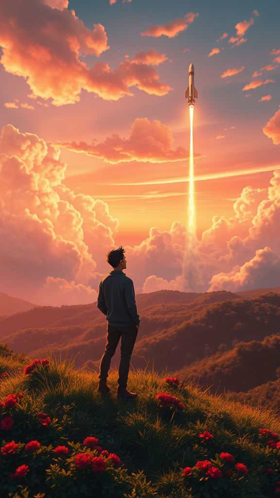 A breathtaking scene depicts a man standing on a hill, captivated by a distant rocket launch. The sky is a rich tapestry of colors, with the sunset illuminating fluffy clouds in hues of orange and pink. The ground beneath is lush and full of vibrant greenery, characteristic of a Studio Ghibli landscape, with whimsical details that draw the viewer in. The art style combines the ethereal quality of Makoto Shinkai’s lighting, capturing the atmospheric depth with volumetric effects. The scene is rendered in high resolution, showcasing meticulous details in the landscape and the man's contemplative expression. The collaboration of Artgerm and WLOP influence the character design with a sense of anime-infused realism. Greg Rutkowski's signature elements are visible in the intricate texture work and the overall composition that guides the eye towards the ascending rocket. The piece is polished to a cinematic quality with Octane's rendering techniques, making it a standout on ArtStation as a true masterpiece.