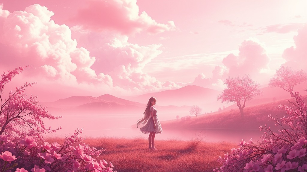 A breathtaking scene enveloped in a harmonious blend of pink hues, capturing the serene beauty of a world bathed entirely in pink. This atmospheric setting is reminiscent of the ethereal style of Makoto Shinkai, with the detailed character designs akin to those by Stanley Artgerm Lau. The dreamy, painterly elements evoke the enchanting artistry of WLOP, while the dynamic composition brings to mind the vibrant techniques of Ross Draws. The landscape is adorned with soft pink clouds drifting across a delicately blushed sky, casting gentle shadows that play across the landscape. Pink-hued flora sways in a gentle breeze, while the subtle shimmer of pink light reflects off a tranquil body of water. A protagonist stands at the heart of this scene, embodying grace and mystery, their silhouette accentuated by the perfect pink lighting that enhances every detail, from the texture of their attire to the gentle expression on their face. The spectacle is completed by a flawless composition that seamlessly integrates every aspect into a cohesive, mesmerizing visual experience.