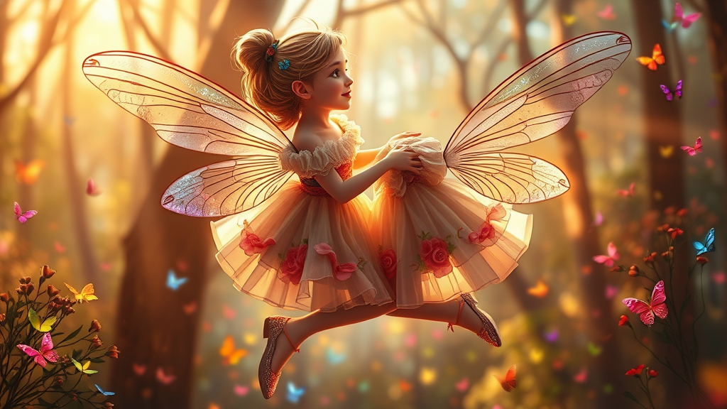 A breathtaking scene featuring two joyful faerie girls soaring through a fantastical, glowing forest, wrapped in an embrace filled with hope and happiness. They share a tender kiss, their petite figures adorned in beautiful, off-the-shoulder floral faerie dresses. Intricately detailed fluffy hair dances in the breeze with stray strands framing their highly detailed, expressive faces. Their eyes and lips glisten with beauty as colorful, symmetrical dragonfly wings shimmer behind them. They wear glamorous diamond heels that catch the vibrant light, creating a kaleidoscope of colors. Hyperdetailed and cinematic, the scene captures the mesmerizing interplay of light and shadow with studio-quality lighting, casting a cozy, nostalgic glow across the forest. A multitude of tiny, colorful butterflies flutter around them, adding to the dreamlike atmosphere. The lush environment is filled with volumetric light and stunning reflections, maximizing the vibrant, fantastical mood of the scene. Every element is meticulously crafted, resulting in an award-winning, masterful 8K visual that embodies glamour, intricacy, and the vibrant essence of a magical fantasy world.