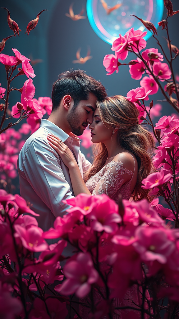 A breathtaking scene of a couple embracing amidst vibrant pink flowers, set in a cyberpunk futuristic world, with elements of gold and azure illuminating their surroundings. The atmosphere teems with fantastical, otherworldly creatures that enhance the sense of magic. The couple, captured as if in a portrait miniature, are a vision of beauty beyond belief. The backdrop is a mesmerizing blend of dark cyan and red hues, creating a visually arresting contrast that accentuates the intimacy of their connection.