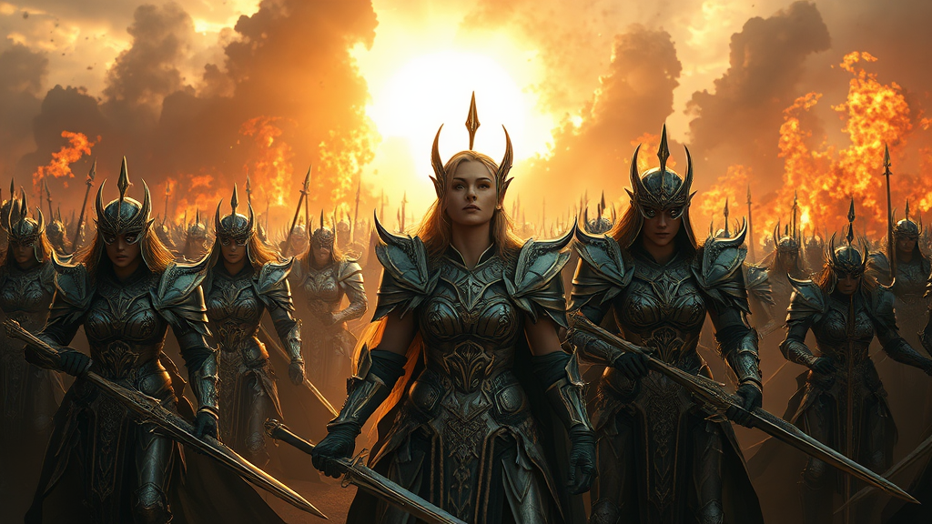 A breathtaking scene of a massive scale conflict features mighty female warriors, with an elven goddess at the forefront. They are clad in intricately designed armor, showcasing stunning beauty and fierce determination. The battlefield, now forgotten, is enveloped in the chaos of an epic war. Walls of fire create a dramatic backdrop as the sun casts its rays through the haze, illuminating details with photorealistic precision. The composition captures an epic wide shot with an aerial perspective, emphasizing the dark fantasy ambiance reminiscent of Diablo's style. Weapons glint with intimidating power, and the atmosphere is charged with the explosive energy of battle. Depth-focused hyperrealism ensures every detail, from the complex armor to the expressions of rage, is captured with maximalist intricacy, forming a captivating and immersive CGI tableau.