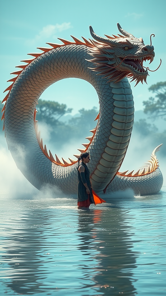 A breathtaking scene of a person standing waist-deep in shimmering water beside a majestic Chinese dragon, set in a fantastical world. The dragon, with its intricate scales and ethereal presence, winds elegantly through the scene, exuding an aura of ancient wisdom. The person gazes in awe, their attire a blend of flowing robes and mystical symbols. The environment reflects a serene ambiance, with mist rising gently from the water and soft sunlight filtering through distant trees. The image captures a moment of harmony between the human and mythical creature, rendered in exquisite detail, vibrant colors, and photorealistic clarity, echoing the artistic styles of Theo Prins, Magewave, and Kuang Hong.