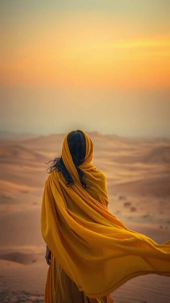 A breathtaking scene of a woman in a flowing yellow scarf, evoking the essence of a biblical drama, with light brown and amber hues illuminating her surroundings. Set amidst a vast desertscape that captures the spirit of desertwave aesthetics, the scene channels the artistic vision of Alan Lee. The cinematic set is reminiscent of David Plowden's captivating style, creating an awe-inspiring moment that is both timeless and enchanting.