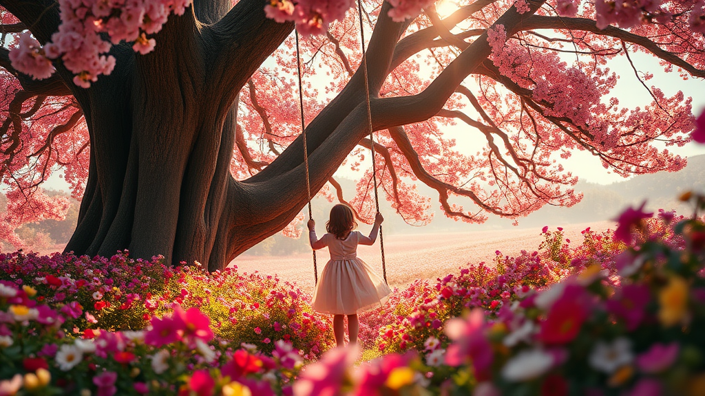 A breathtaking scene of a young girl gracefully swinging beneath a majestic tree, enveloped by a vivid sea of spring flowers in an explosion of color. The image is high quality, capturing the enchanting atmosphere with soft, volumetric lighting. Despite some low resolution and minor textural errors, the charm of the scene prevails. Subtle imperfections like slightly distorted fingers and softly blurred edges add character, though are easily overshadowed by the captivating beauty of the setting. This dreamy landscape invokes a sense of wonder and tranquility, like stepping into a serene, magical world.