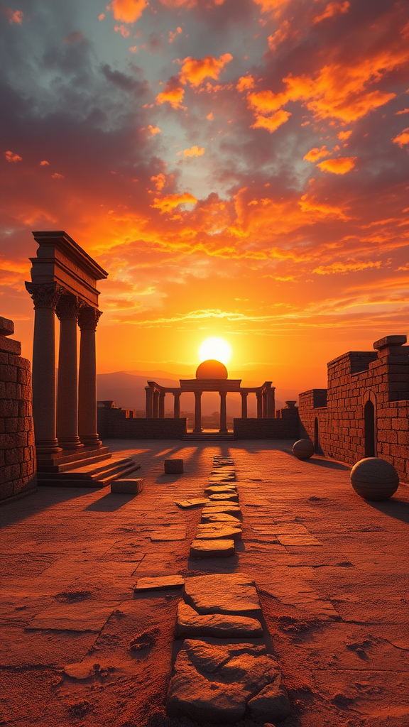 A breathtaking scene of ancient ruins set in a deserted landscape, bathed in the warm glow of a dramatic sunset. The epic sky is painted with vivid oranges and purples, casting long shadows across the intricate stonework. The composition is reminiscent of a cinematic masterpiece, captured with sharp focus and featuring intricate details that bring the history of the place to life. It evokes the artistic techniques of Greg Rutkowski, combining elements of fantasy and realism, resulting in a highly detailed and mesmerizing visual that could be trending on Artstation.