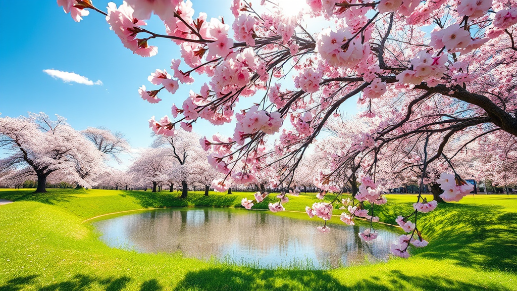 A breathtaking scene of cherry blossoms in full bloom, their delicate pink petals contrasting against a crystal-clear blue sky, with gentle sunlight filtering through the branches, casting playful shadows on a serene pond surrounded by lush green grass. The landscape is alive with the soft hum of bees and a gentle breeze that sets the blossoms dancing, creating a tranquil and enchanting atmosphere that invites peaceful contemplation.