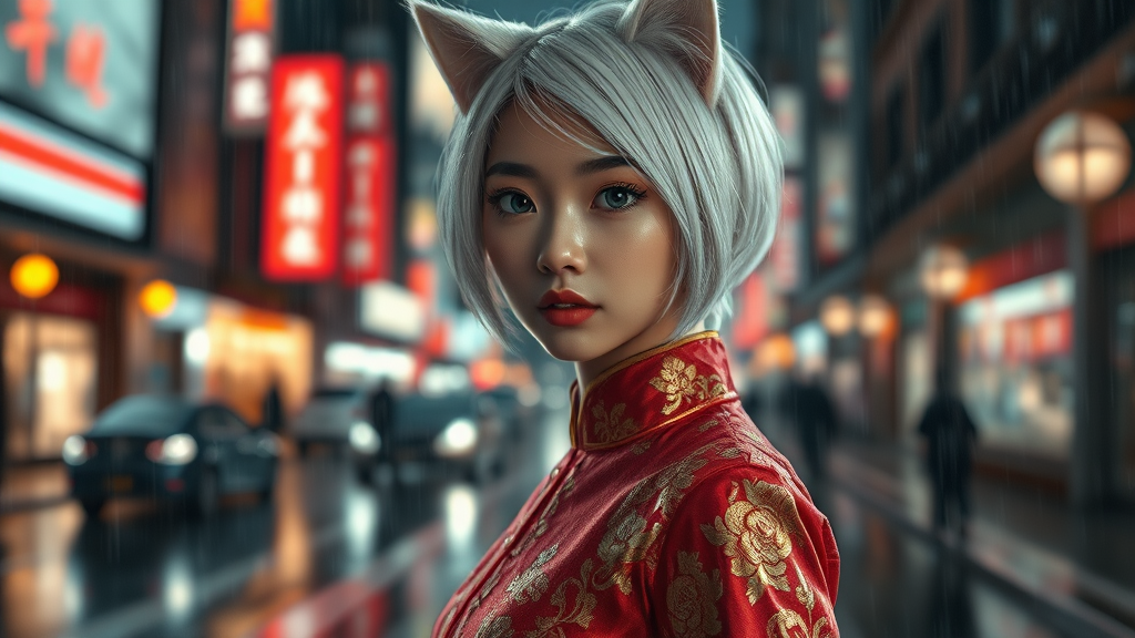 A breathtaking scene set in a dark, rainy city captures a petite cat girl with stunning white hair and olive skin. Her mesmerizing eyes gaze through cinematic lighting that accentuates the hyperrealism of the setting. She wears a beautifully intricate red and gold qipao, its traditional patterns shimmering in the gentle rain. The fabric hugs her toned silhouette, highlighting her petite frame and small breasts, while her short, wispy white hair frames her delicate features. The depth of field focuses on her in the bustling city, reflections of neon lights dancing around her. Each droplet of rain adds texture to the stunning environment, creating an 8k UHD photograph that captures the quiet strength and elegance of this charming, ethereal figure.