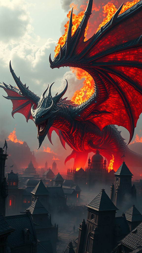 A breathtaking scene unfolds as a monstrous Deathwing emerges, its colossal form wreathed in roaring flames that ascend high above an ancient city. The creature's spiky mounds and dark bronze scales shimmer with a sinister red glow, each detail meticulously sculpted in a ZBrush-inspired style. Shadows dance across the landscape, evoking a sense of crowcore's haunting allure. Its expression is wildly exaggerated, capturing both fury and a predatory intelligence. This stunning masterpiece, reminiscent of Bayard Wu's work, depicts a world on the brink of apocalypse, with creative touches enhancing the drama and intensity without straying from the core vision.