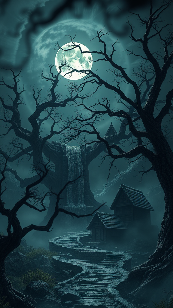 A breathtaking scene unfolds in a dark fantasy realm, where swirling mists and eerie shadows intertwine under a moonlit night. Realistic lighting casts a haunting glow over ancient, twisted trees and a mystical, deserted village. Full HD and 8K details reveal intricate textures of weathered stone and gnarled branches, creating an immersive experience. The concept art, brought to life with the Unreal engine, showcases a landscape filled with hidden secrets and untold stories. Volumetric lighting punctuates the atmosphere with ethereal beams that break through the canopy, highlighting the trending aesthetics on Artstation.