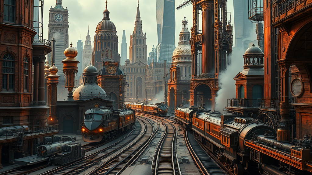 A breathtaking scene unfolds in a polished copper metallic steampunk city, where ornate and intricate details of Victorian architecture blend seamlessly with retrofuturistic elements. The cinematic lighting casts a warm glow over the biomechanical railroad, its tracks winding through the city like veins of copper. Towering structures with elaborate engravings and brass accents dominate the skyline, resembling a fantastic vision from the minds of Jules Verne and H.G. Wells. In the heart of this enchanting metropolis, engineers work amidst clouds of steam, their creations echoing the essence of Lady Mechanika's world. This awe-inspiring cityscape is captured in stunning UHD, HDR, 8K resolution, revealing every meticulous detail and texture in brilliant clarity.