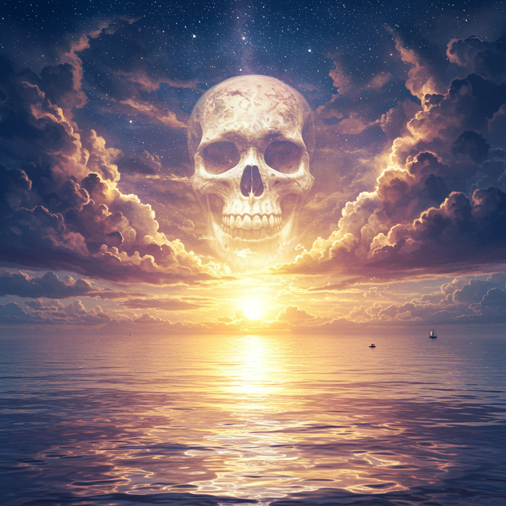 A breathtaking scene unfolds with a sky infused with realistic yet fantastical elements, where luminous clouds resemble intricate skull motifs. Beneath this celestial display, a light-filled seascape glimmers with ethereal beauty. The water reflects the vibrant skies, creating a mesmerizing dance of light and color, evoking a sense of wonder akin to discovering untouched realms. The artwork's texture, reminiscent of a zbrush creation, invites you to explore its exquisite details. This piece feels like a journey into another world, merging elements of travel and discovery, capturing the essence of the transavanguardia movement. It's a masterpiece that evokes disbelief at its beauty, inviting viewers into a realm where imagination meets reality.