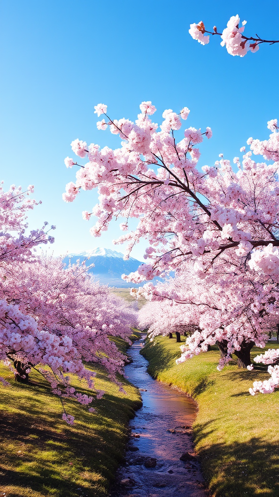 A breathtaking scene unfolds with cherry blossoms in full bloom, their soft pink hues dancing in gentle waves across the landscape. Underneath a clear blue sky, the blossoms form a delicate, cascading canopy that whispers in the breeze, bathing the ground in dappled light. A serene path meanders through this floral paradise, leading to a tranquil stream that reflects the vibrant colors of the blossoms. In the background, distant mountains stand majestically, their peaks dusted with snow, contrasting with the blossom’s ethereal beauty. This enchanting vista captures the harmonious blend of nature's artistry.