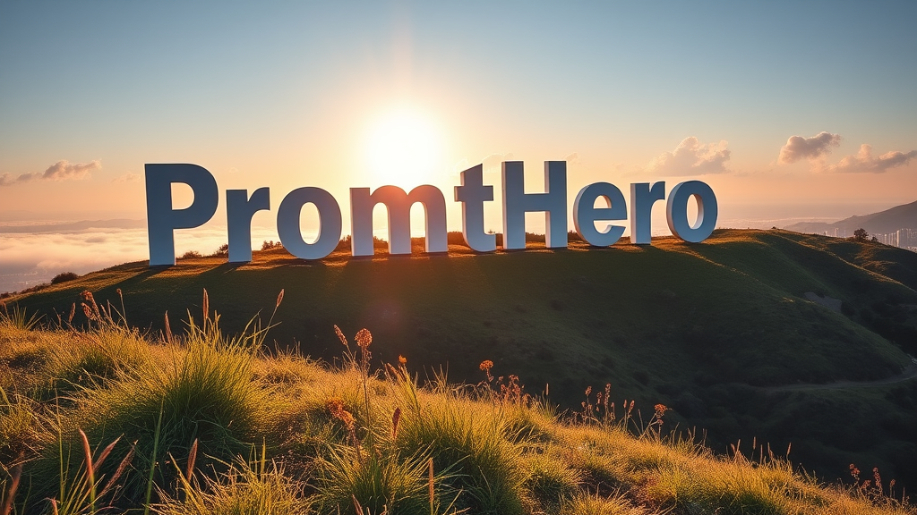 A breathtaking scenic landscape at sunrise featuring a large billboard on rolling hills, reminiscent of the iconic Hollywood sign, with giant, sleek white letters spelling "PromptHero." The letters are slightly tilted, catching the soft golden light, casting long shadows on the grass below. A few vibrant wildflowers and tall grasses gently sway around the base of the sign, while fluffy clouds float in a clear blue sky. In the distance, a city skyline is faintly visible through a light morning mist, adding depth to the scene.